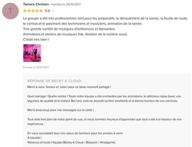 In addition to official concerts throughout France and neighboring countries, Becky & Cloud also perform at your private events: birthday, wine of honor, engagement ceremony, even concert in your living room, garden or any other unusual place.